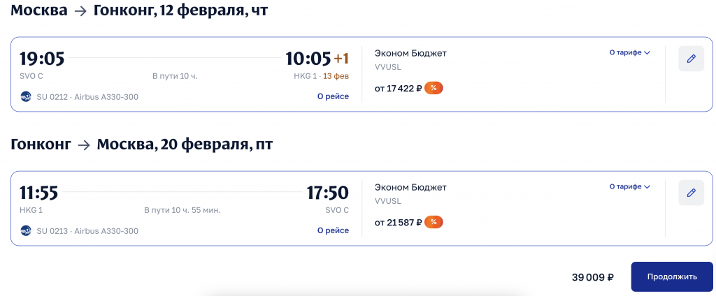 Прямые рейсы Аэрофлота из Москвы в Гонконг 39.000 рублей туда-обратно.