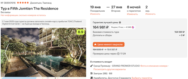 Fifth Jomtien The Residence с завтраками 82.500 рублей за человека (165.000 рублей за двоих)