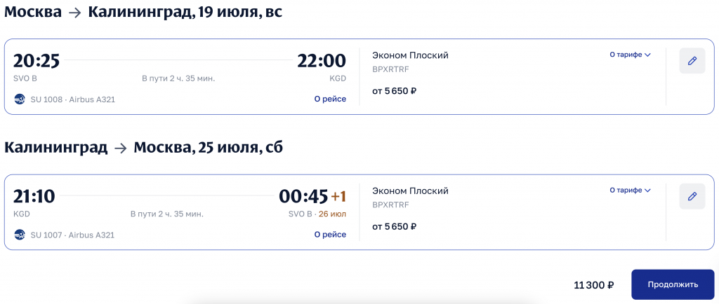 Аэрофлот: в Калининград летом 11.300 рублей туда-обратно.