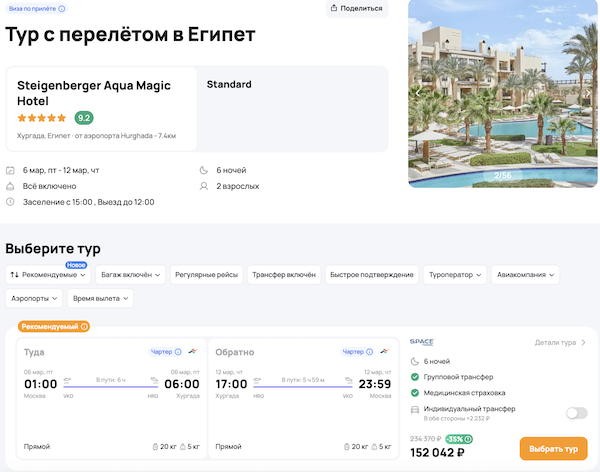 В Египет на 8 марта, 5*, все включено: туры из Москвы от 57.600 рублей за человека.