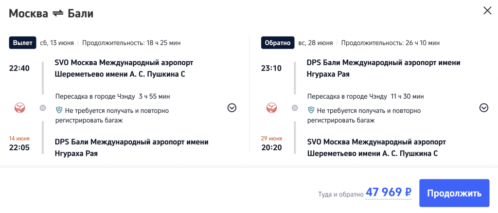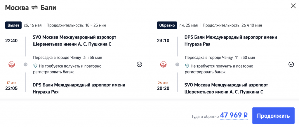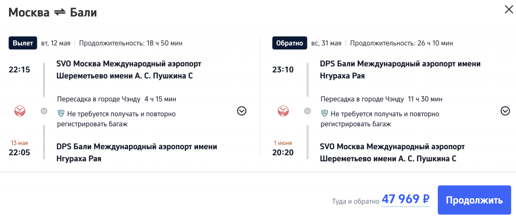 Рейсы выполняются Sichuan Airlines с пересадкой в Чэнду.