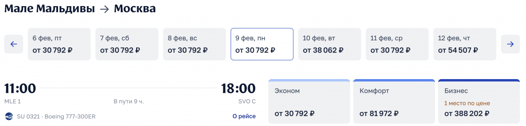 Обратные билеты на сайте Аэрофлота 30.800 рублей