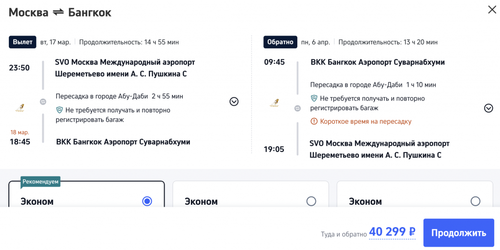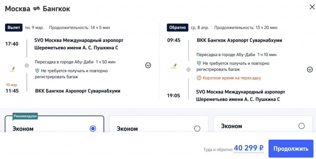 Рейсы выполняются с короткой пересадкой в Абу-Даби.