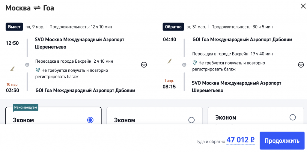 Билеты из Москвы в Гоа в марте от 47.000 рублей туда-обратно.
