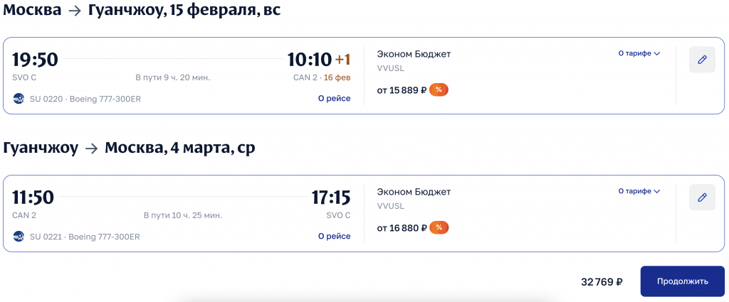 Прямые рейсы Аэрофлота из Москвы в Гуанчжоу в феврале 32.800 рублей туда-обратно.