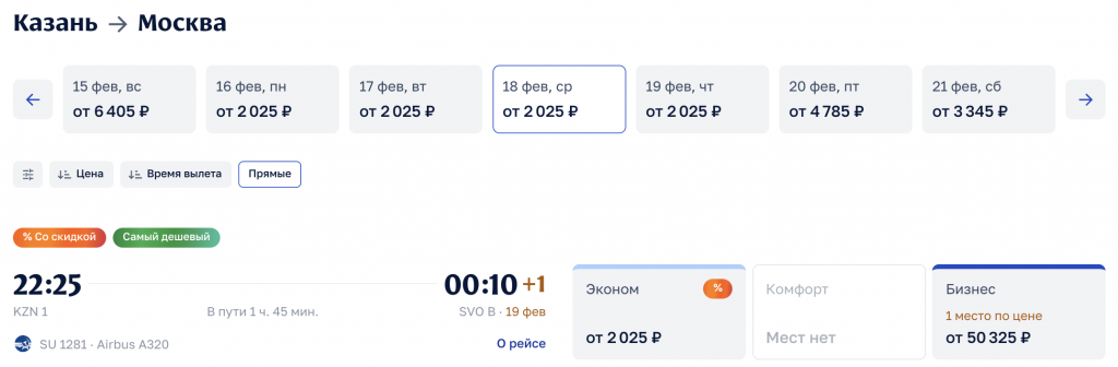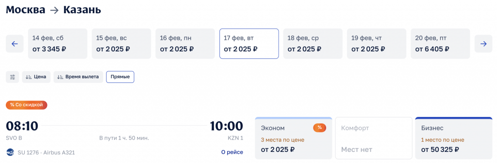 Аэрофлот: из Москвы в Екатеринбург и Казань в феврале от 2.000 рублей в каждую сторону.