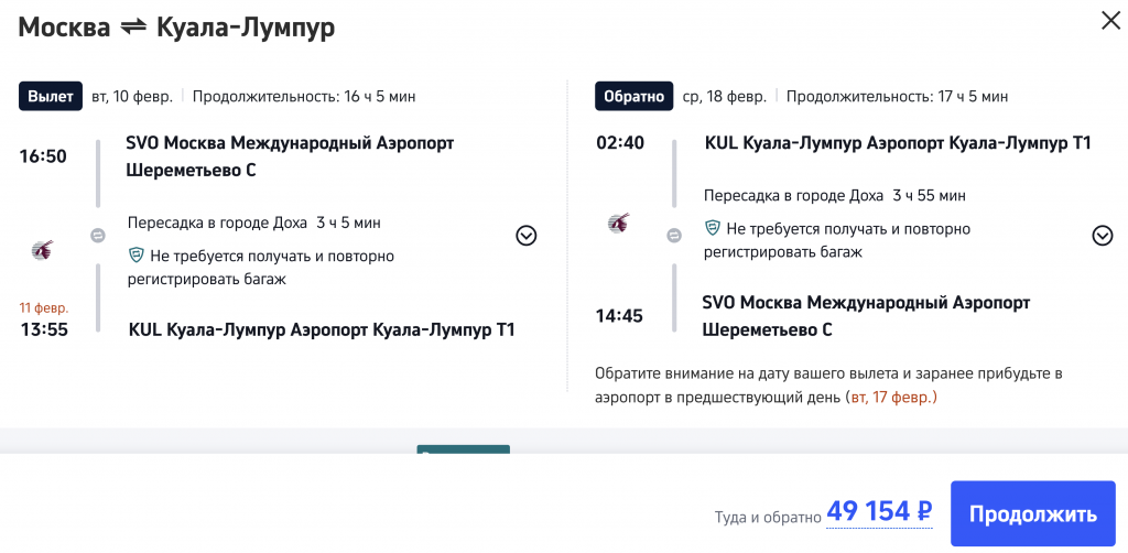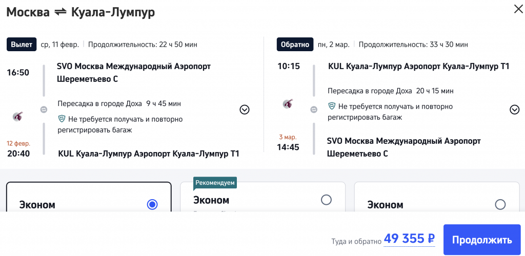 Qatar Airways: из Москвы в Малайзию в феврале от 49.200 рублей туда-обратно.