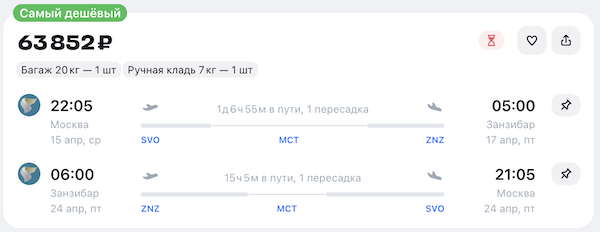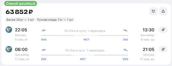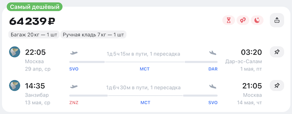 Москва — Дар-эс-Салам 29 апреля; Занзибар — Москва 13 мая