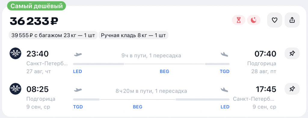 Билеты из Санкт-Петербурга в Черногорию в августе-сентябре 36.200 рублей туда-обратно.