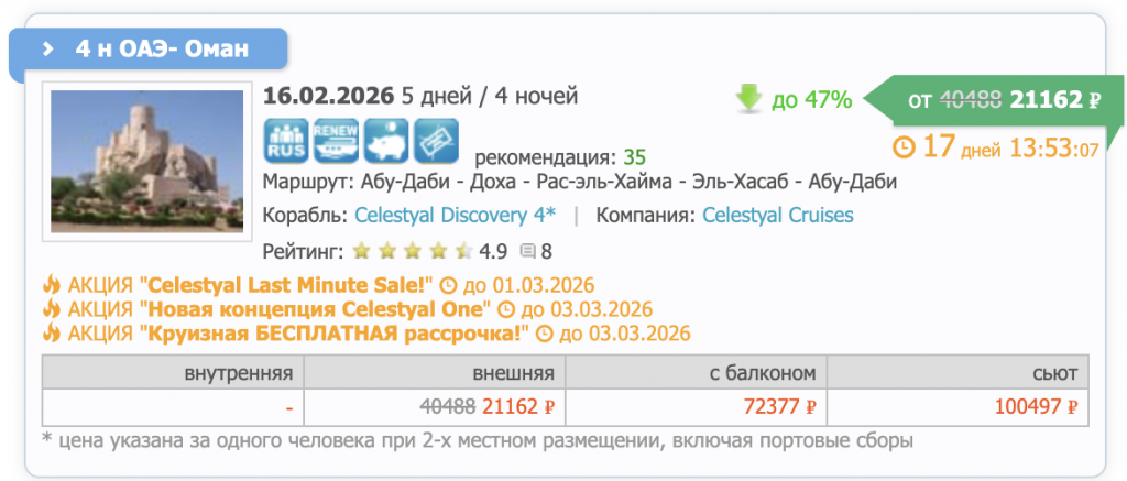 Стоимость указана за 1 человека при размещении двоих человек в каюте.