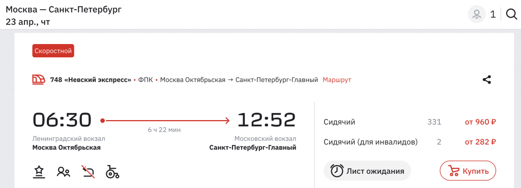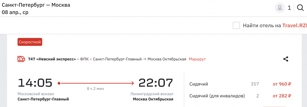 Билеты на скоростные поезда между Москвой и Санкт-Петербургом от 960 рублей в каждую сторону.