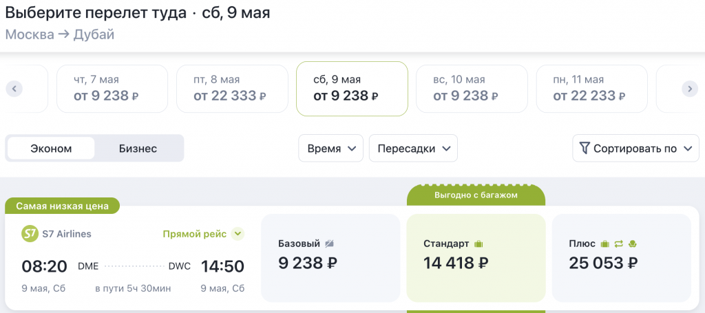 Из Москвы рейсами S7 утром 7, 9 или 10 мая 9.200 рублей