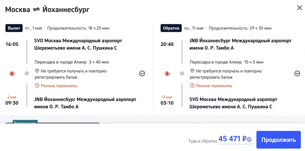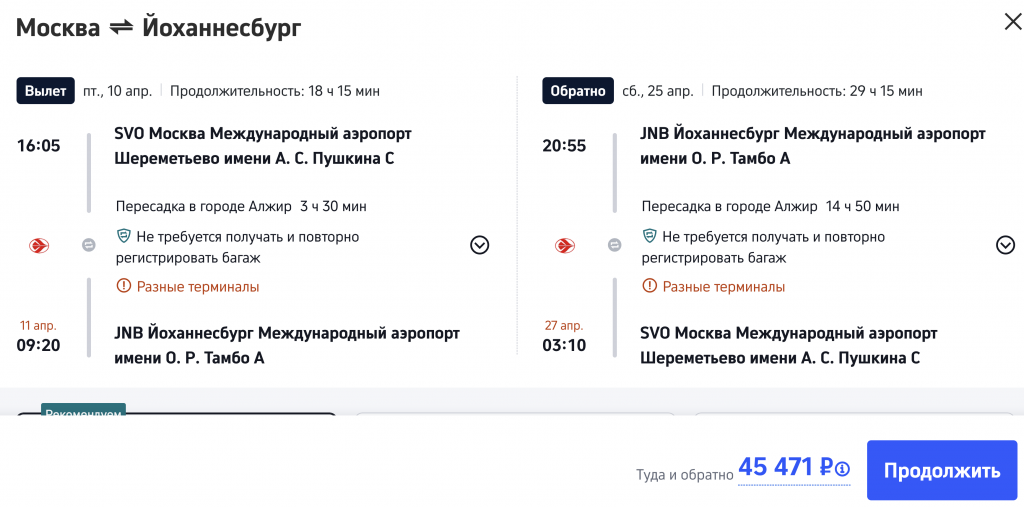Из Москвы в ЮАР весной: билеты в Йоханнесбург от 45.500 рублей туда-обратно.