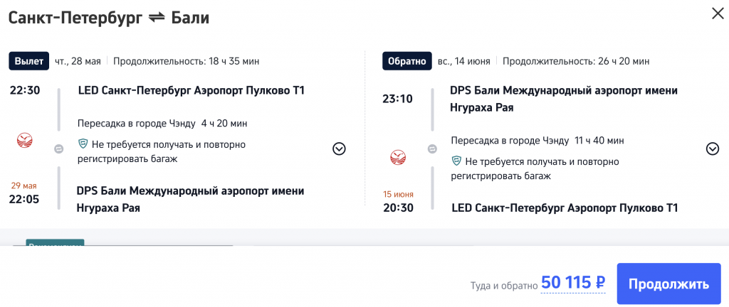 Из Санкт-Петербурга на Бали в начале лета 50.100 рублей туда-обратно.