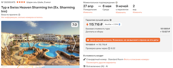 Swiss Heaven Sharming Inn 4* 57.800 рублей за человека (115.700 рублей за двоих)