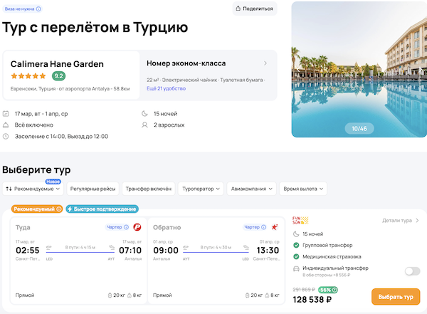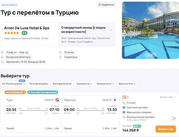 — прямой перелет в Анталью и обратно;