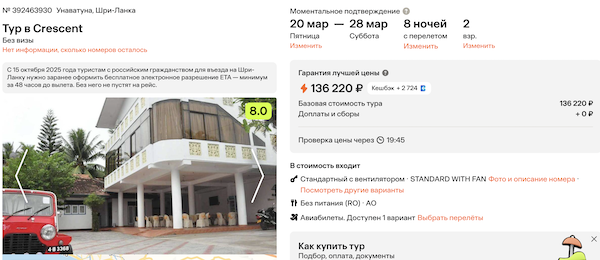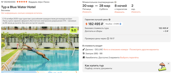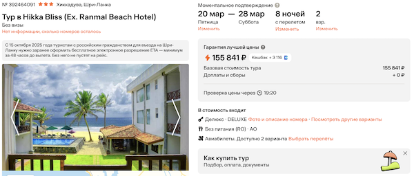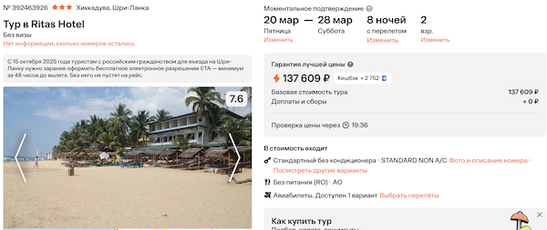 Горящие туры из Москвы на Шри-Ланку от 68.100 рублей за человека.