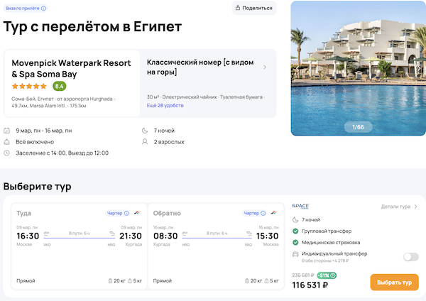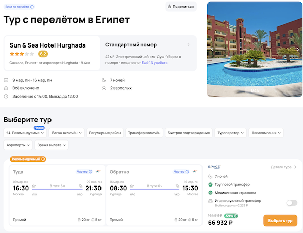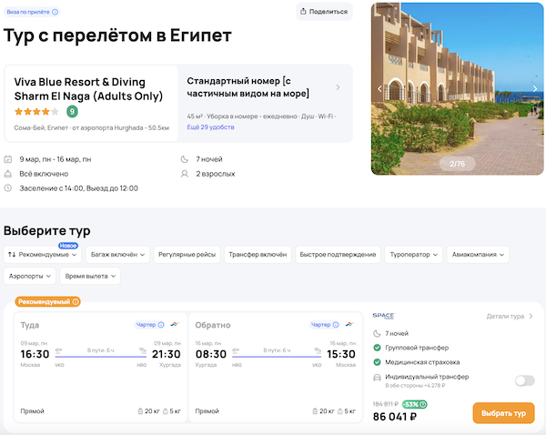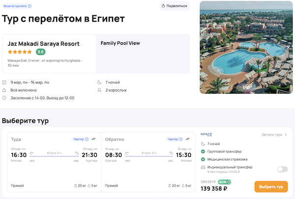 — прямой перелет в Хургаду и обратно;