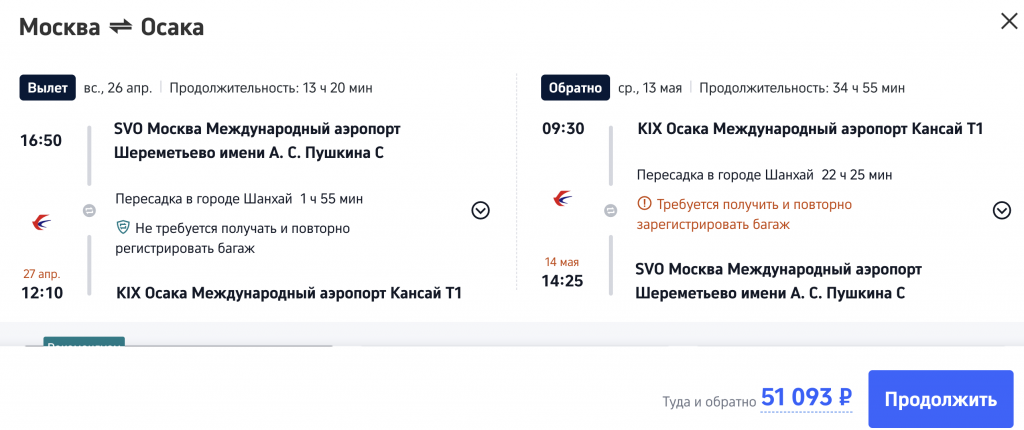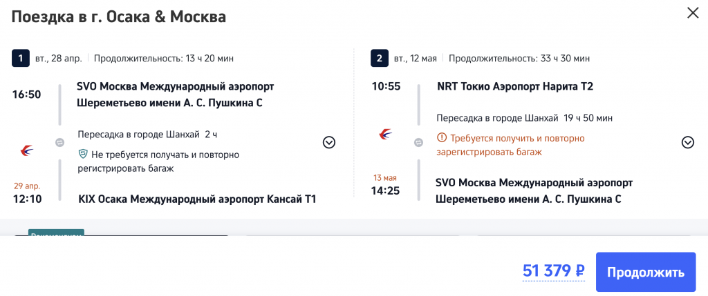 Москва — Осака 28 апреля; Токио — Москва 12 мая