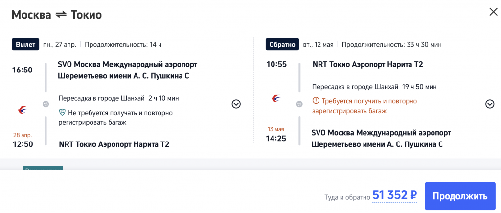 Рейсы China Eastern выполняются с пересадкой в Шанхае.