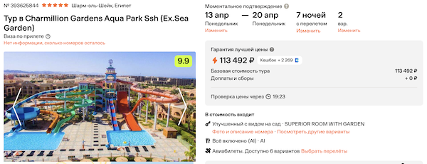 Charmillion Gardens Aqua Park Ssh 56.700 рублей за человека (113.500 рублей за двоих)
