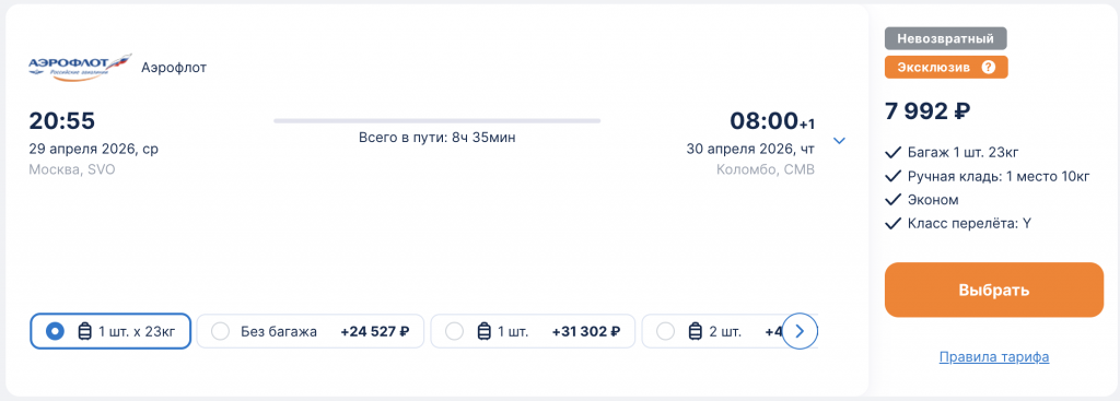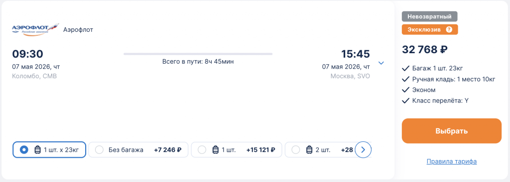 Горящие билеты на прямые рейсы Аэрофлота из Москвы на Шри-Ланку 40.800 рублей туда-обратно.