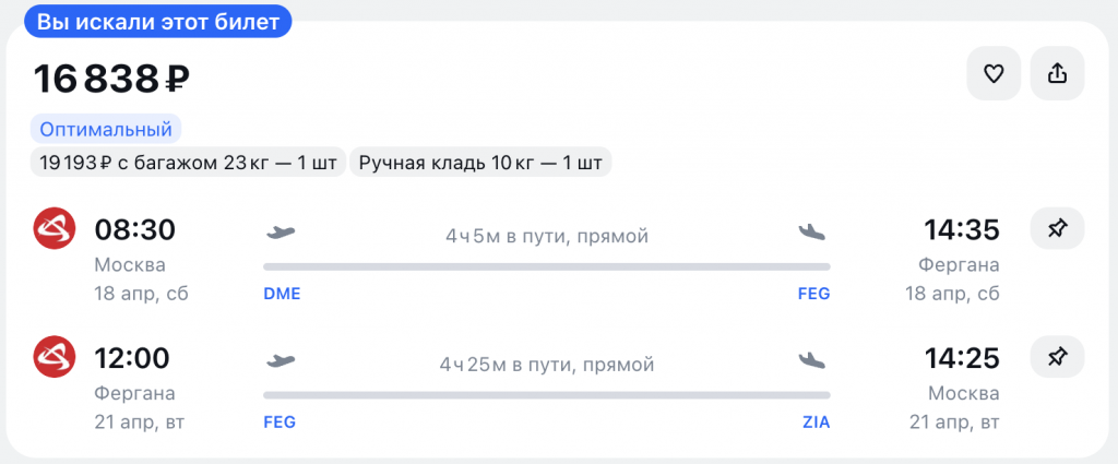Из Москвы в Узбекистан: билеты в Фергану от 16.800 рублей туда-обратно.