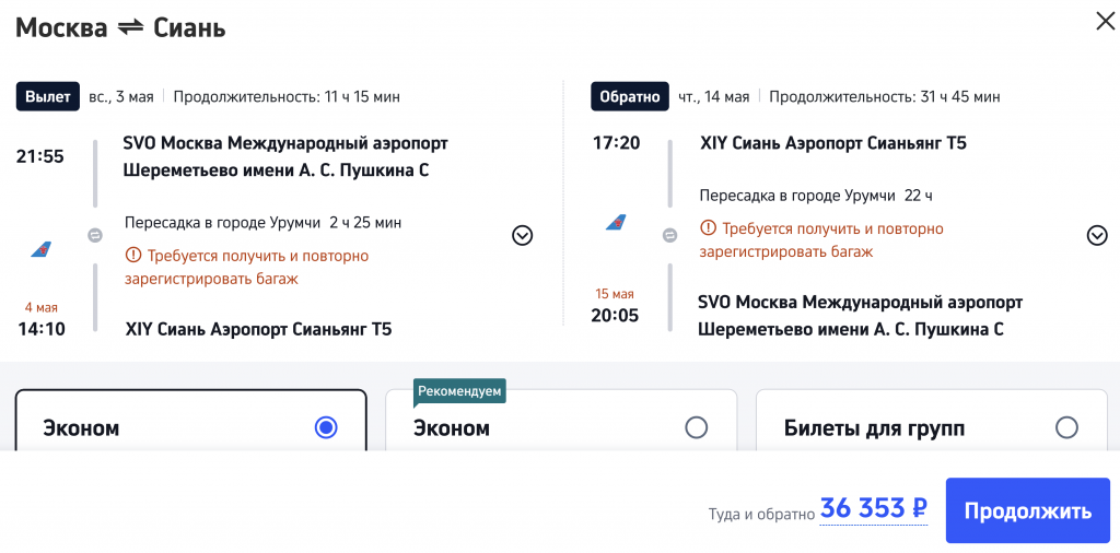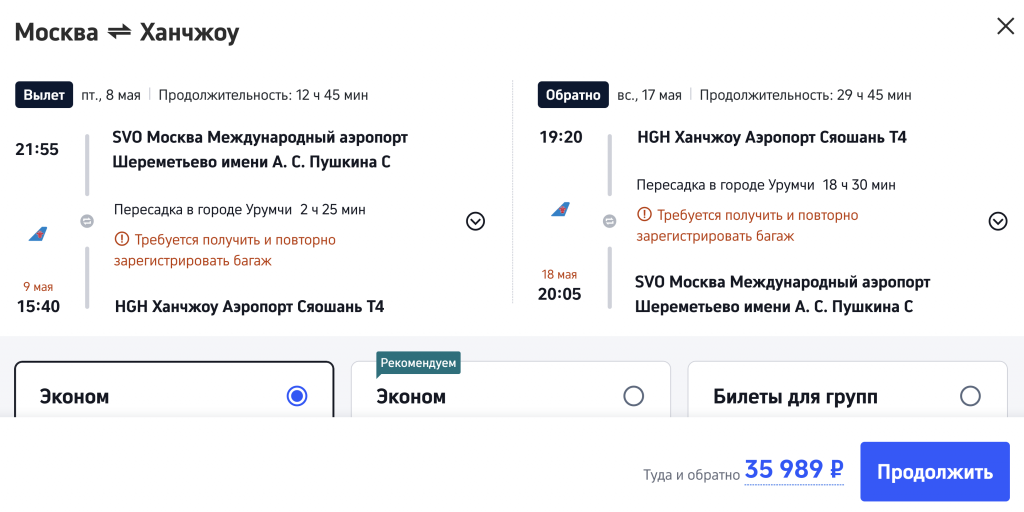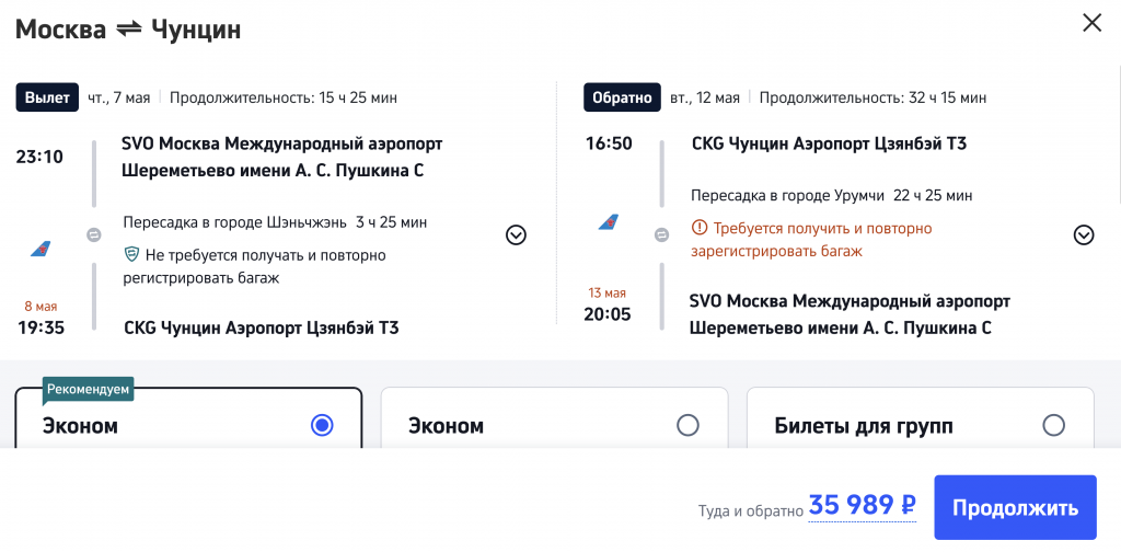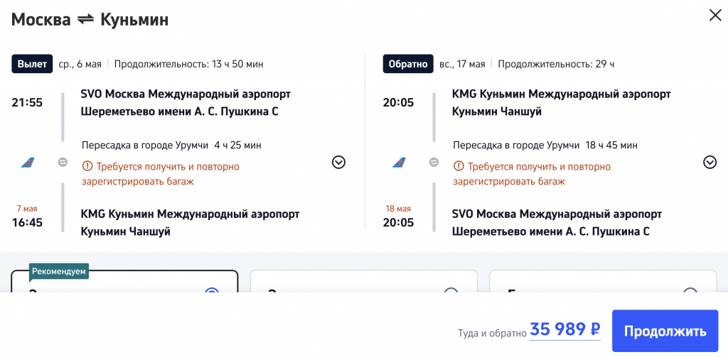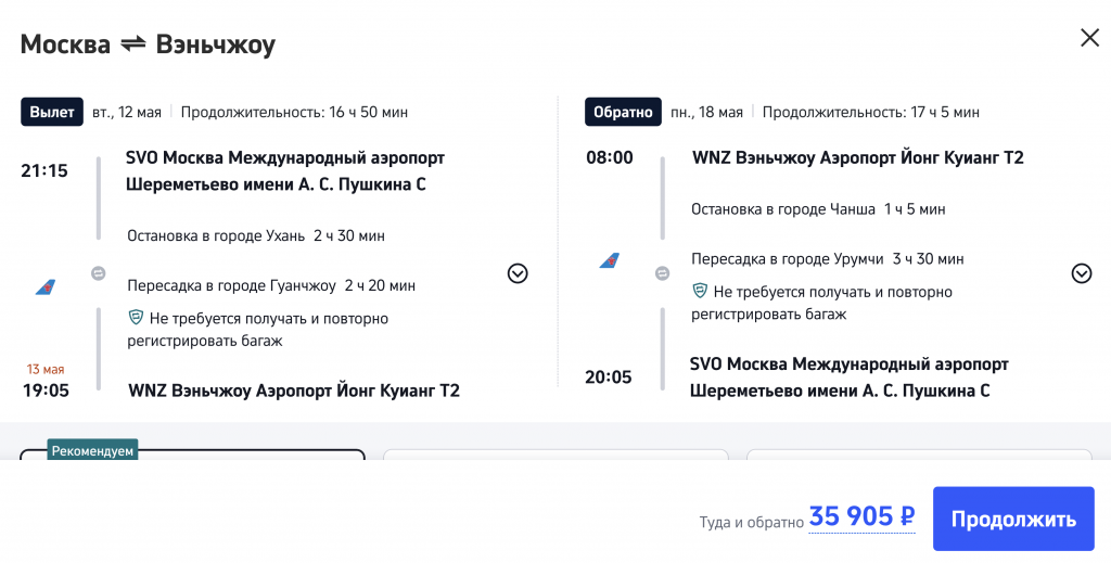 Из Москвы в Китай в начале мая: билеты в Чунцин, Куньмин, Вэньчжоу и другие города от 35.900 рублей туда-обратно.