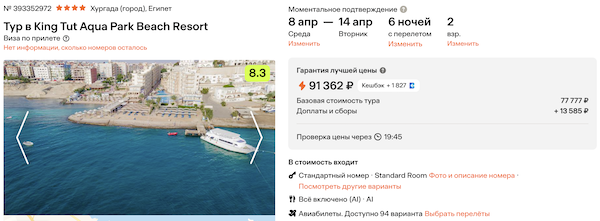 King Tut Aqua Park Beach Resort 4* 45.700 рублей за человека (91.400 рублей за двоих)