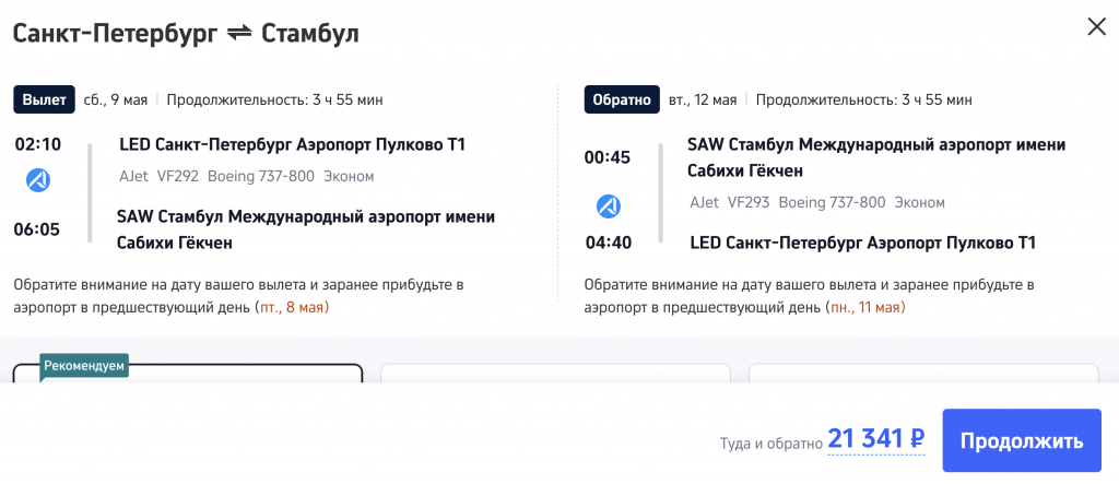Из Санкт-Петербурга в Стамбул на майские или июньские праздники 21.300 рублей туда-обратно.