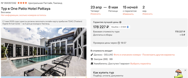 One Patio Hotel Pattaya 4* с завтраками 89.100 рублей за человека (178.200 рублей за двоих)