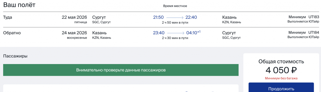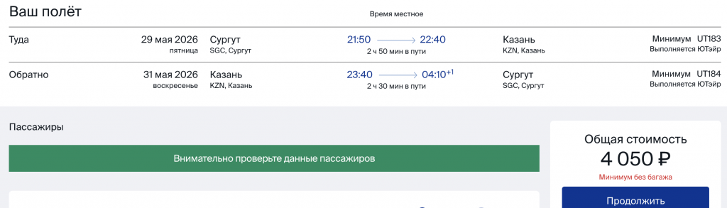 Из Сургута в Казань на выходные в мае 4.000 рублей туда-обратно.