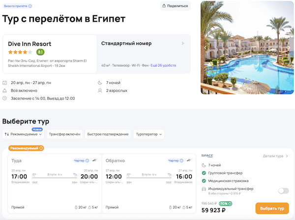 Туры из Владикавказа в Египет на неделю в конце апреля от 22.500 рублей за человека.