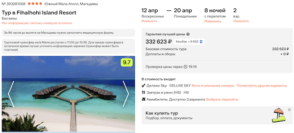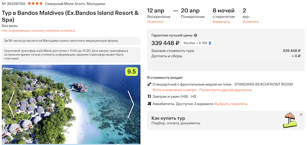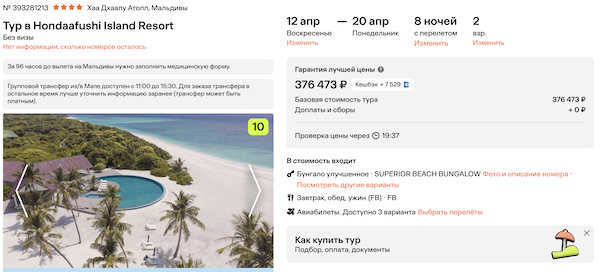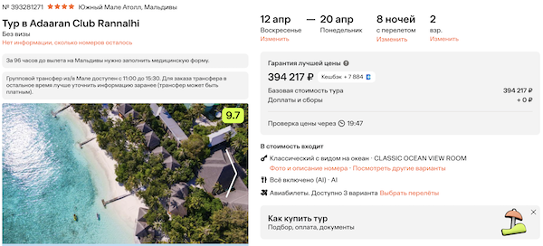 Туры из Москвы на Мальдивы на неделю в апреле от 166.300 рублей за человека.