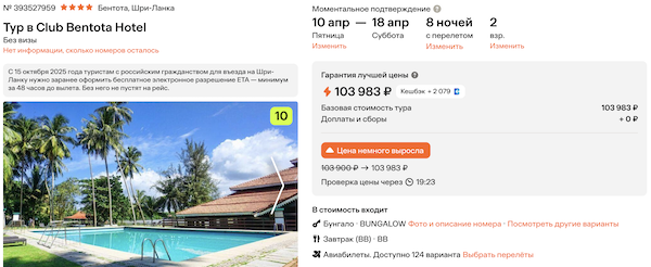 Club Bentota Hotel 4* с завтраками 52.000 рублей за человека (104.000 рублей за двоих)