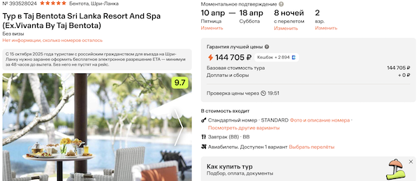 Taj Bentota Sri Lanka Resort And Spa 5* с завтраками 72.300 рублей за человека (144.700 рублей за двоих)