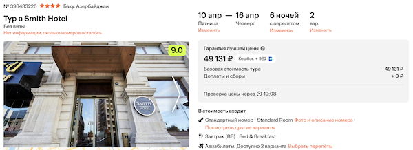 Smith Hotel 4* с завтраками 24.500 рублей за человека (49.100 рублей за двоих)