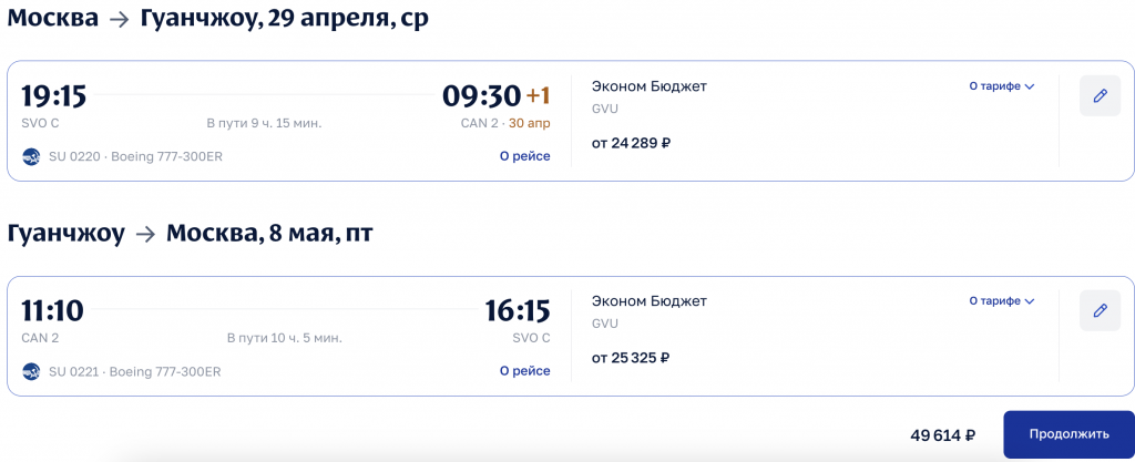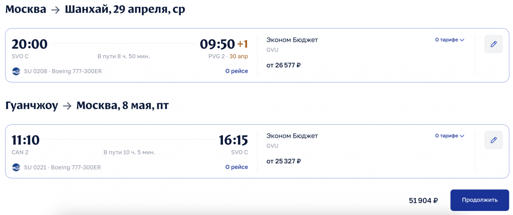 Москва — Шанхай 29 апреля; Гуанчжоу — Москва по 8 мая