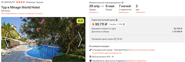 Mirage World Hotel 4* все включено 47.800 рублей за человека (95.700 рублей за двоих)