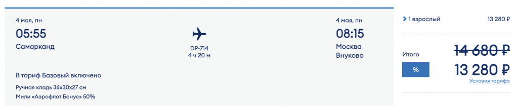 Из Самарканда в Москву утром 4 мая 13.300 рублей. Билеты на сайте Победы с использованием промокода KUKU.