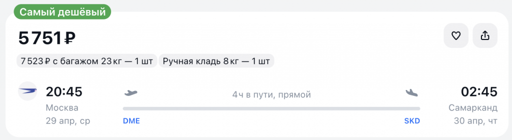 Из Москвы в Самарканд вечером 29 апреля 5.700 рублей, билеты на авиасейлс.