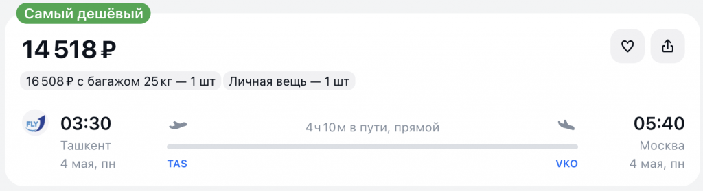 Или из Ташкента в Москву утром 4 мая 14.500 рублей, билеты на авиасейлс.