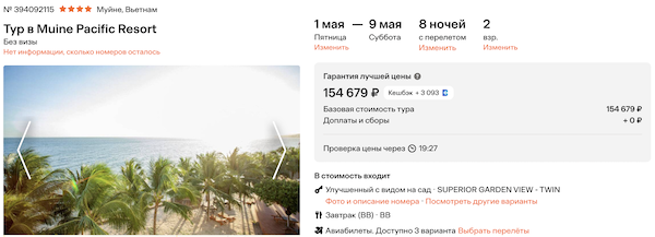 Muine Pacific Resort 4* с завтраками 77.300 рублей за человека (154.700 рублей за двоих)