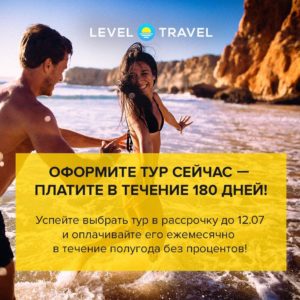 Классная акция у level travel: отдыхайте сейчас, а платите потом. Любые туры можно купить в беспроцентную рассрочку на 180 дней!