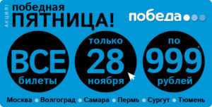 28 ноября авиакомпания Победа проводит распродажу билетов между Москвой и Волгоградом, Самарой, Пермью, Сургутом, Тюменью. Билеты на многие даты до конца марта (включая выходные) стоят около 3 000 рублей туда-обратно.
